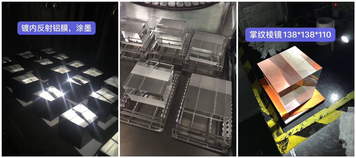 The recently finished prisms are rather big, sized 138*138*110mm, the difficult point is applying both AR and Aluminium coatings, which took us more than 1 month to get ideal effects.