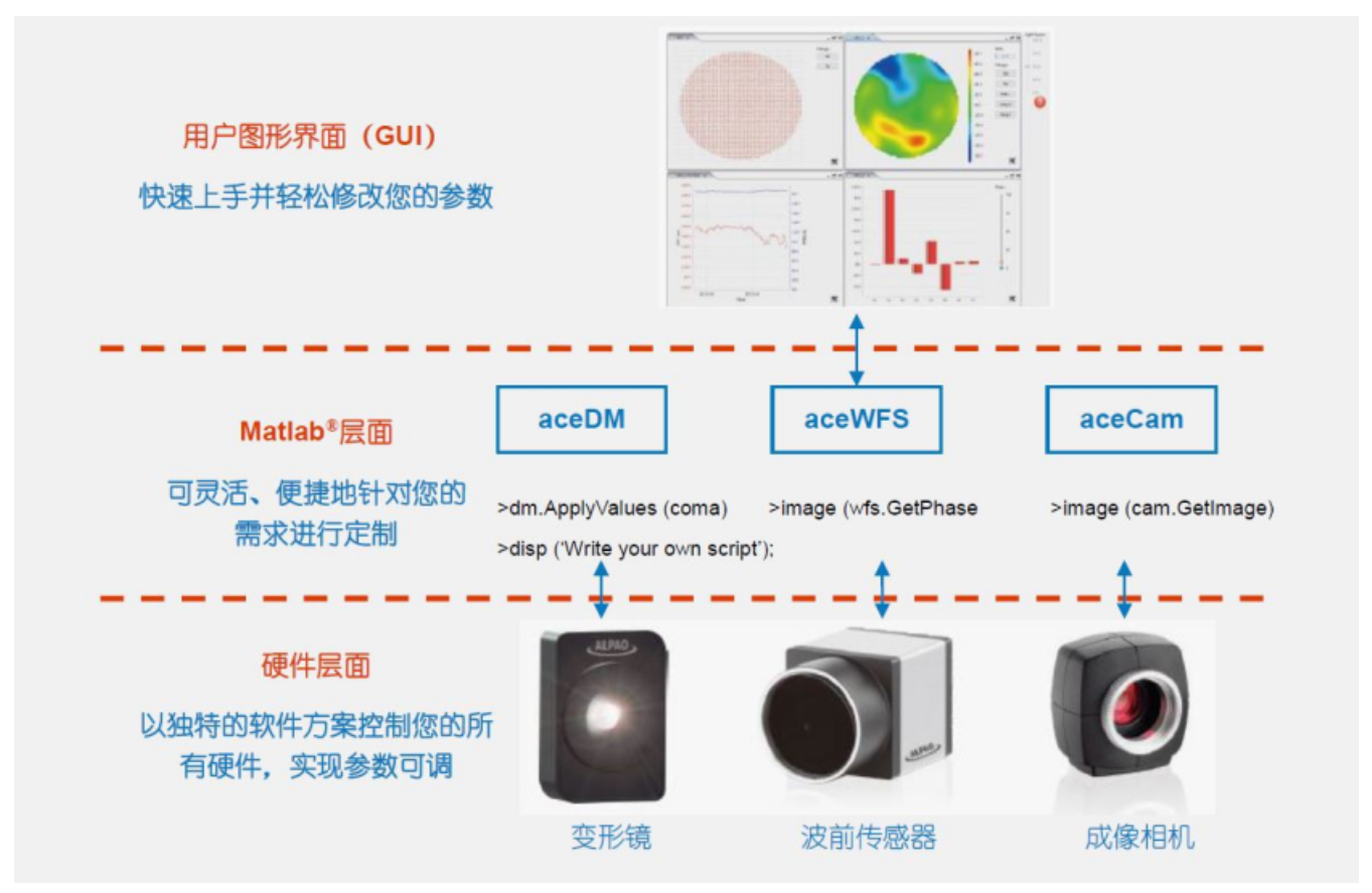 ALPAO核心引擎软件(ACE)为法国ALPAO开发的一款灵活、开放、易用且实惠的自适应光学软件系统。 作为基于对象的Matlab®工具箱,其内置函数让用户可对系统中所有光电设备进行参数设置、控制及监视。 对首次接触自使用光学的初学者,通过ACE的用户图形界面即可轻松完成系统的闭环操作。而对高级用户, ACE可成为用户开发自制算法和定制系统的绝佳垫脚石。充分考虑到大多数光学实验所需的暗光条件, ALPAO现推出全新黑色软件界面!